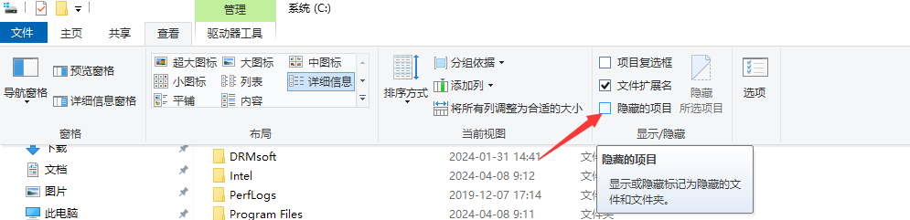 如果你在C盘下找不到ProgramData目录,请显示隐藏项目后查找。