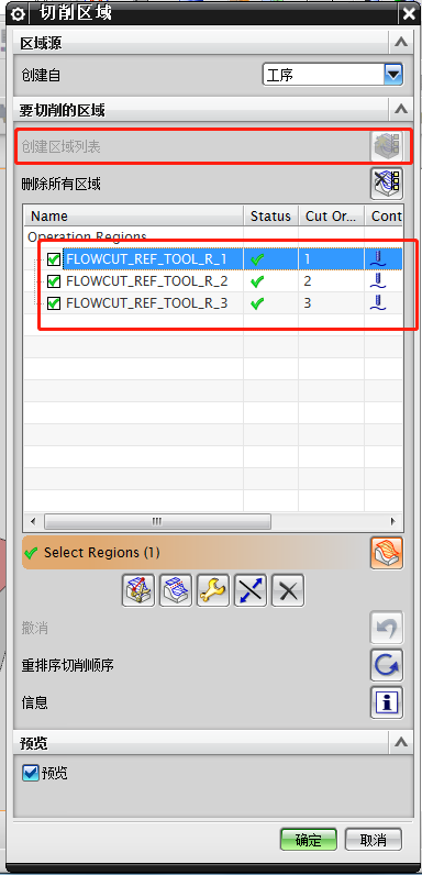 2、先生成刀路,再点击切削区域,在切削区域-要切削的区域里选择创建区域列表,下面就会生成切削区域,可以调整顺序位置、分割、删除、编辑等,如下图所示:
