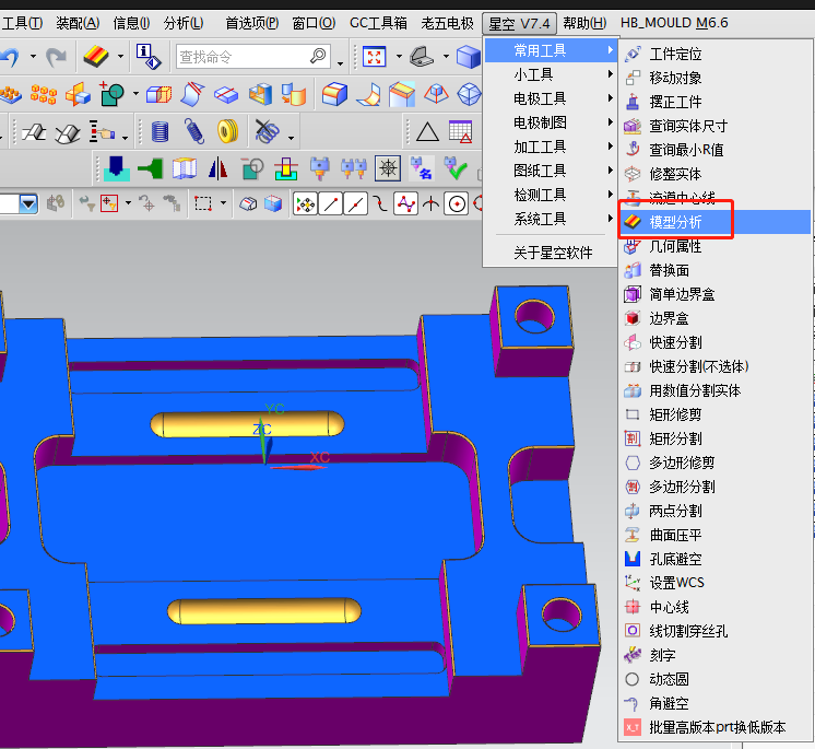 1、用外挂把体的平面分好颜色。点击常用工具-模型分析,再点击工件,进行颜色分析,此时平面就会统一为一种颜色。如下图所示: