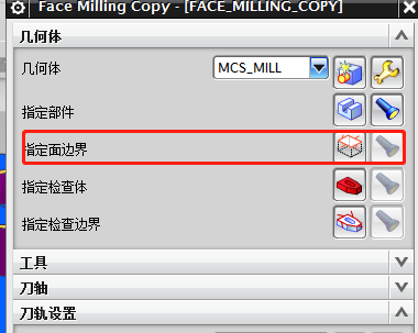 2、打开一条面铣进行操作,点击指定面边界,如下图所示: