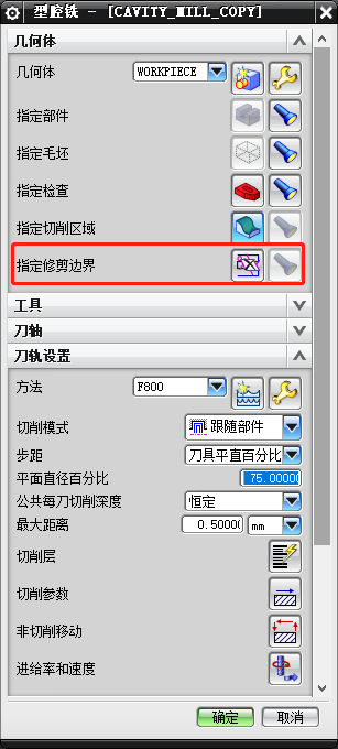1、打开型腔铣工序,点击指定修剪边界,如下图所示: