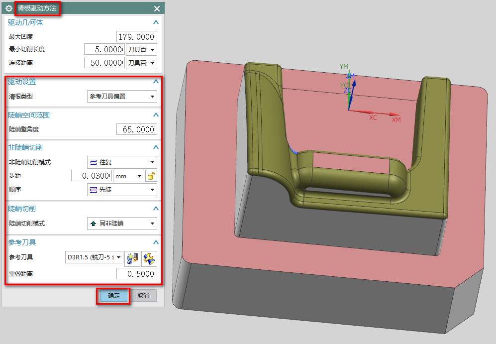 3、在清根驱动方法界面中,清根类型-参考刀具偏置,非陡峭切削与陡峭切削根据用的刀具设置好参数,设置完成后点确定, 如下图所示: