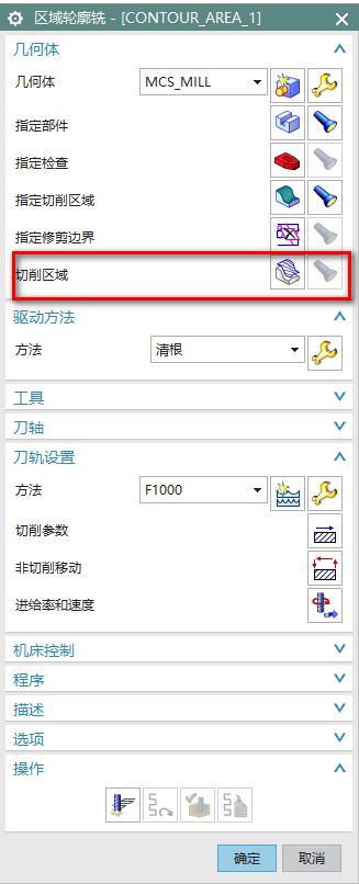 4、回到区域轮廓铣界面后,点击切削区域创建,如下图所示: