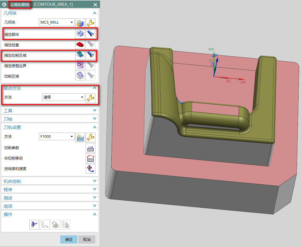 2、在区域轮廓铣界面中,指定部件选择工件,指定切削区域选择要加工的范围,驱动方法-清根,如下图所示: