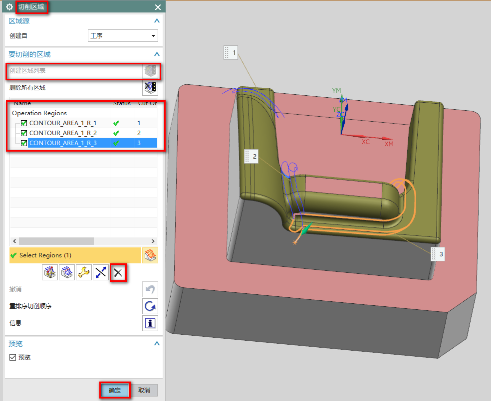5、在切削区域界面中,点击创建区域列表,然后会自动生成清根的区域,选择想要移除的刀轨,点击X删除,确定后生成刀路就会把多余的清根刀路给移除,如下图所示: