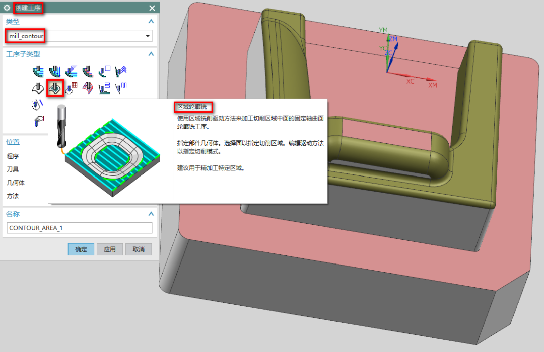 1、在加工界面中,创建工序-mill_contour-区域轮廓铣,如下图所示: