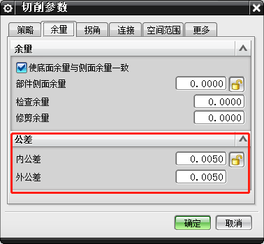2、打开切削参数-余量-公差,内公差与外公差都设置0.005MM,如下图所示: