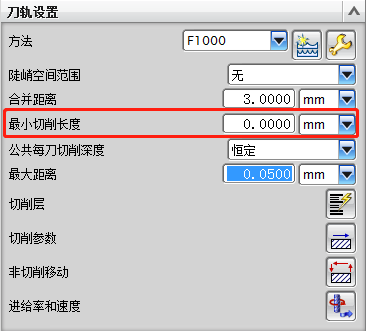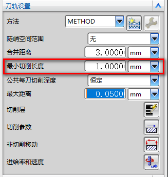 1、等高加工孔时,刀具直径要小于孔的直径,打开刀轨设置-最小切削长度,最小切削长度默认设置为1MM,这里因为区域比较小所以需要把最小切削长度改为0,如下图所示: