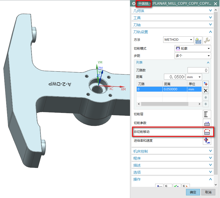 3、在加工界面中,双击打开要设置的刀轨界面,平面铣-非切削移动,如下图所示: