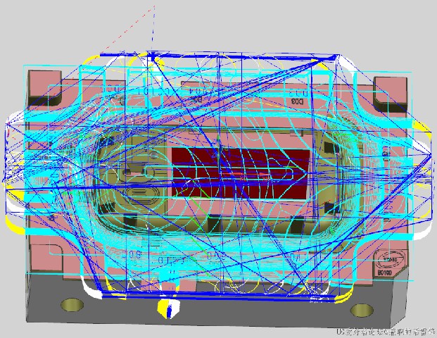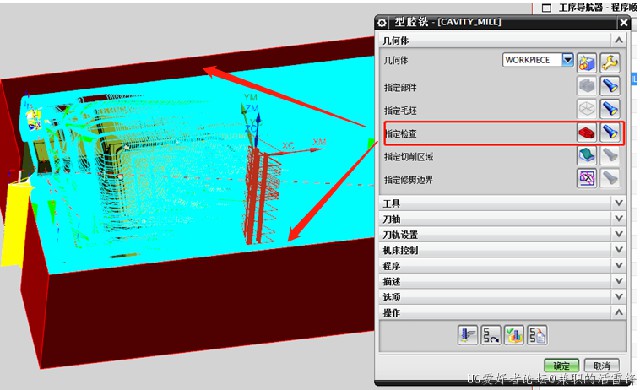 4、打开型腔铣-指定检查,把做好的两个片体选为检查体,生成刀路,这样就得到了一个优化完的型腔铣钢料开粗刀路,如下图所示: