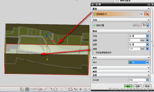 1、 沿着工件最大外形拉伸一圈片体,高度要超过工件,如下图所示: