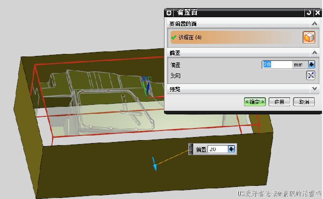 2、使用偏置面往外偏置,距离要比开粗刀的半径大5MM左右,这样加大是为了防止边缘位置加工不到留下残料,假设要使用D30R5开粗,偏置距离最少为刀具半径加3-5MM,那么就可以把偏置距离设置为20MM,如下图所示: