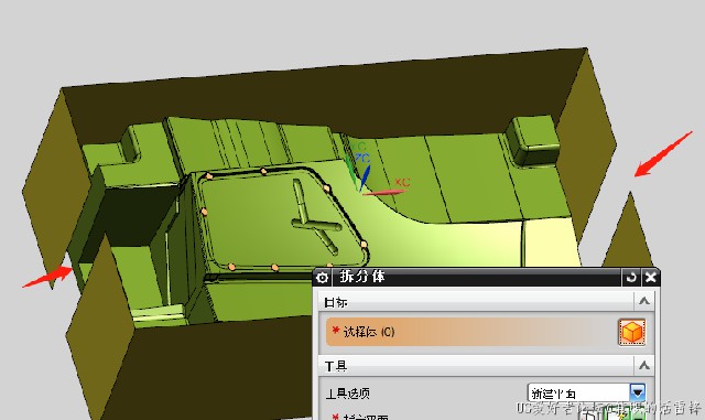 3、偏置完后,外形已经被片体挡成封闭区域,这时做出的刀轨就只能在内部进刀,也就意味着会踩刀,为了避免踩刀问题,使用拆分体在两边切开,方便刀具从外面切削进去,可以在工件开放区域切开,大小要超过刀具直径,如下图所示: