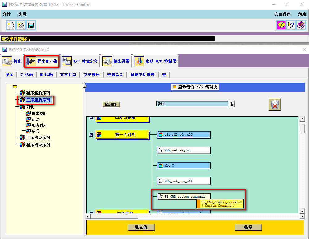 4、在程序和刀轨界面,工序起始序列,第一个刀具这里是设置程序开头的变量,如下图所示: