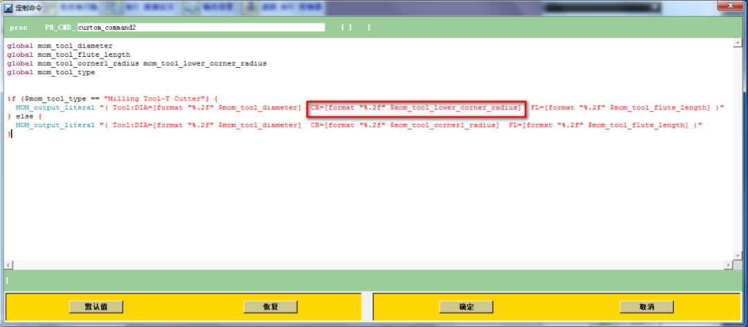 MOM_output_literal "( Tool:DIA=[format "%.2f" $mom_tool_diameter] CR=[format "%.2f" $mom_tool_corner1_radius] FL=[format "%.2f" $mom_tool_flute_length] )"