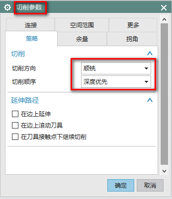 2、在【切削参数】界面中,【切削方向】设置【顺铣】,【切削顺序】设置【深度优先】,如下图所示: