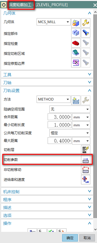 1、打开深度轮廓加工(等高)界面,点击【切削参数】,如下图所示:
