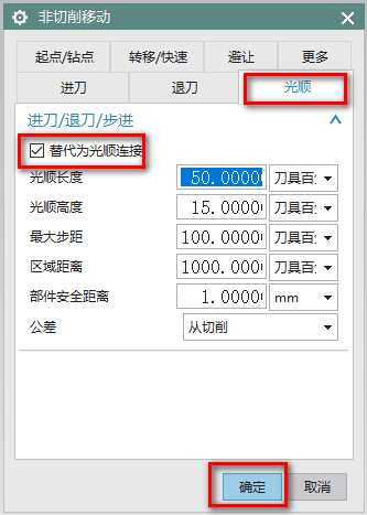 5、打开【非切削移动】,【光顺】-勾起【替代为光顺连接】,这样设置进退刀就会直径光顺过渡连接在一起,从而实现无跳刀情况,如下图所示: