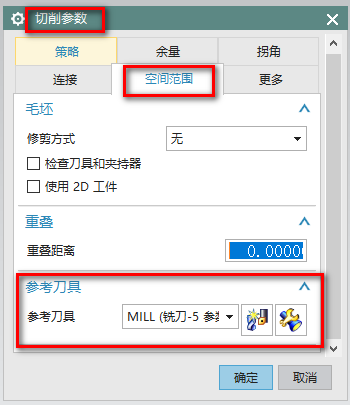 4、在【切削参数】界面中,【空间范围】-【参考刀具】-设置上一把刀加工的直径,如下图所示: