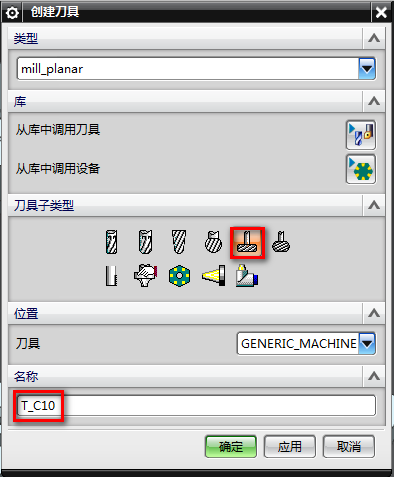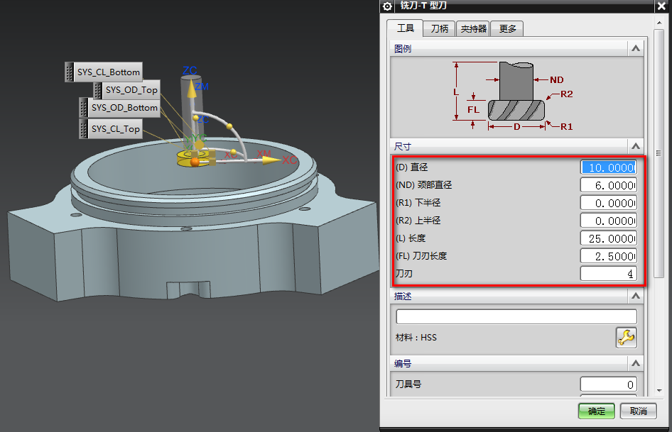 3、现在已经知道T槽的高度为2.5MM,宽度为1.6MM,那么我们要来算一下T刀的大小。T刀除去刀柄直径应该单边要超过1.6MM,比如我们T刀直径为10MM,那么单边减去2MM,得到刀柄直径就是6MM,刀刃长度以2.5MM为主。在加工界面创建这把T刀,创建刀具选择TC刀具,如下图所示: