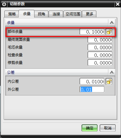 8、因为槽的高度和T刀一样,所以是没办法留底面余量的,可以留一些侧面余量,切削参数-余量,部件余量设置0.1,如下图所示:
