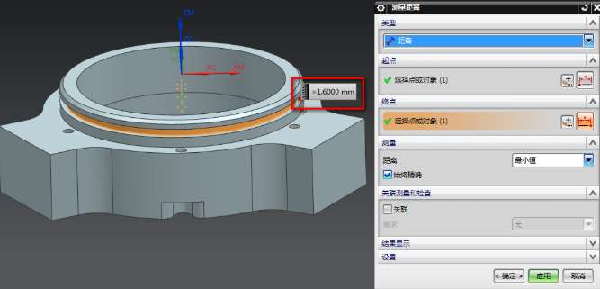 2、再测量一下从外面到内部的距离为1.6MM,那么T刀刀具的距离必须要大于1.6MM,否则刀柄会撞侧面,如下图所示: