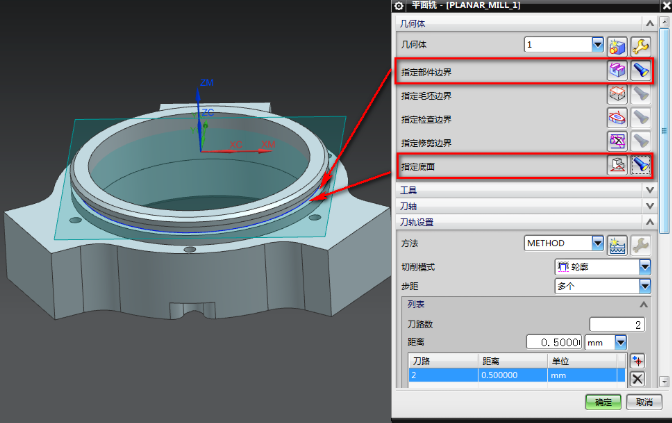 6、指定部件边界-选择T槽内部的边界,指定底面-选择T槽底部的面,如下图所示:
