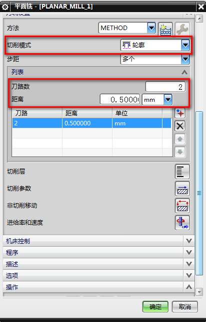 7、切削模式-轮廓,槽宽为1.6,按照铝料来切削,一刀T0.5MM左右,设置步距-多个,0.5MM附加2条,如下图所示: