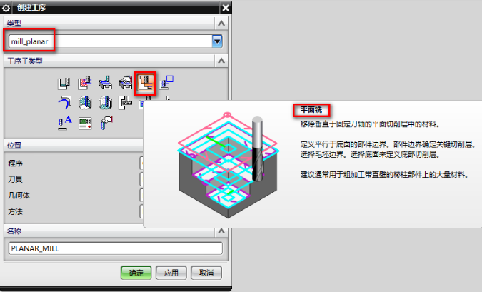 5、刀具创建好后,创建工序-mill-planar-平面铣,如下图所示: