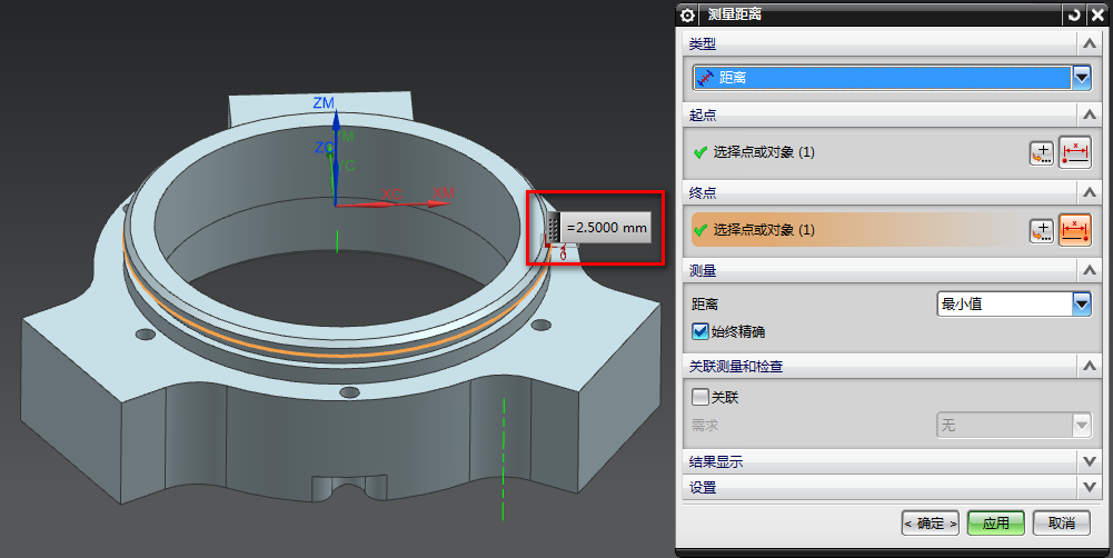 1、在建模环境下,使用测量距离,先测量一下T槽的高度,得到距离为2.5MM,如下图所示: