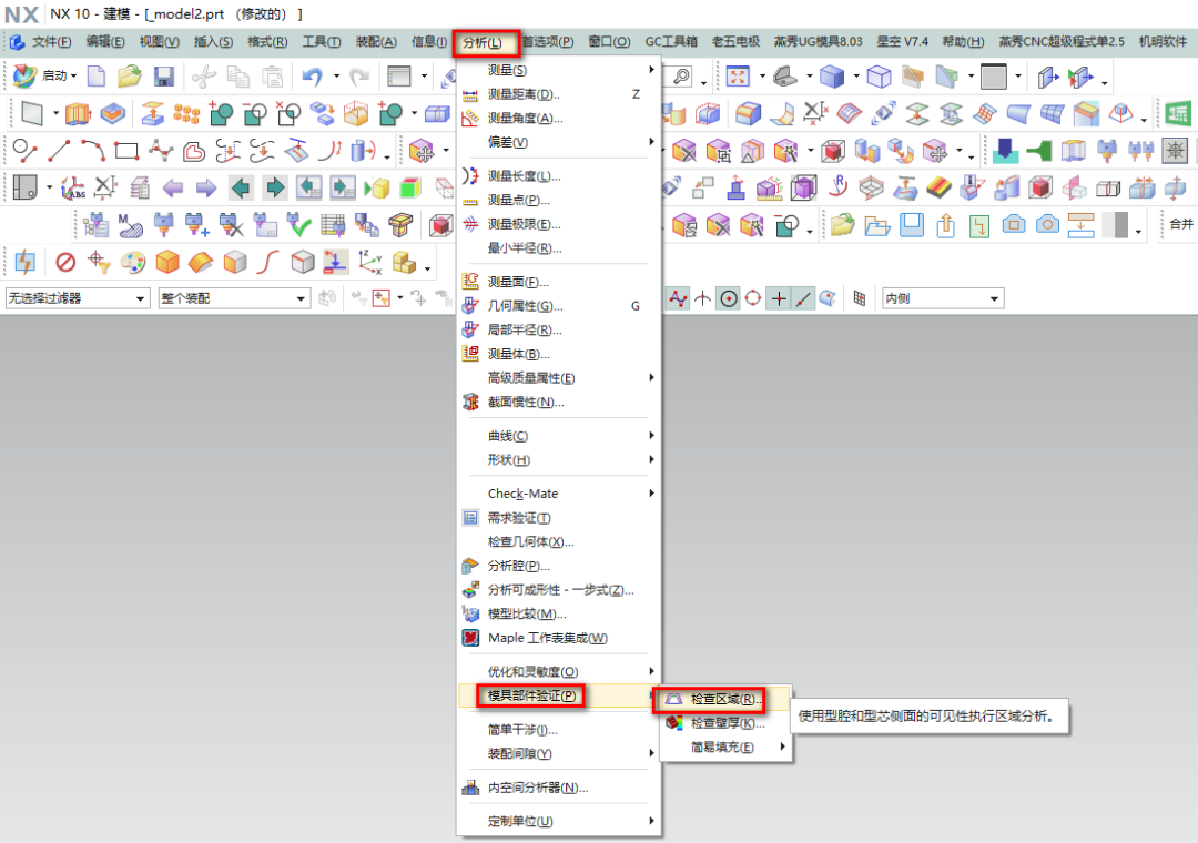 1、在建模环境下,首先找到分析-模具部件验证-检查区域,如下图所示: