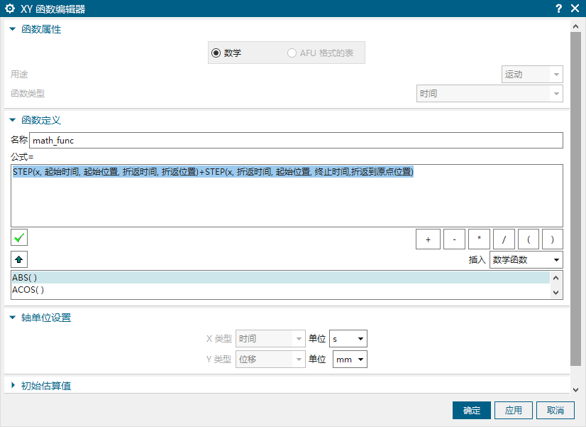 左边的:x不用管就默认的,“起始时间:0”位移在“起始位置:0”->到了“折返时间:5”的时候位移运动到“折返位置:800”的位置,那么我们想要他折返怎么办,我们就加一段时间5秒到10秒的函数,也就是右边的step函数。