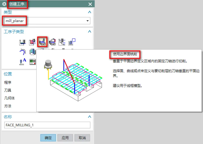 1、在加工界面中,创建工序-mill-planar-使用边界面铣削,如下图所示: