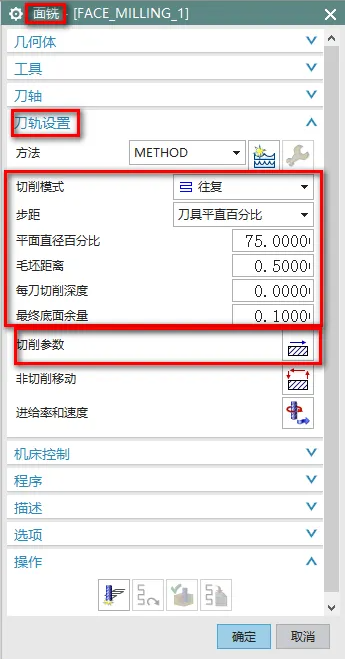 3、在面铣界面中,刀轨设置