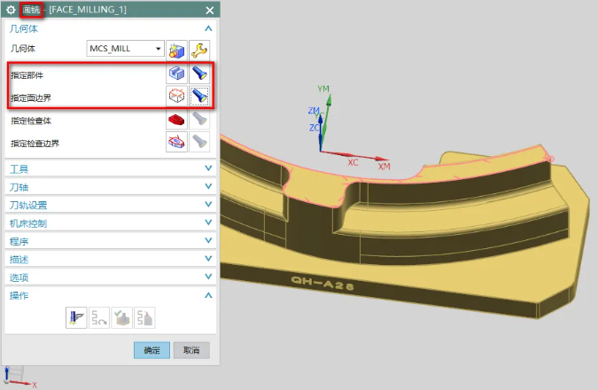 2、在面铣界面中,指定部件选择工件,指定面边界选择一个平面,如下图所示: