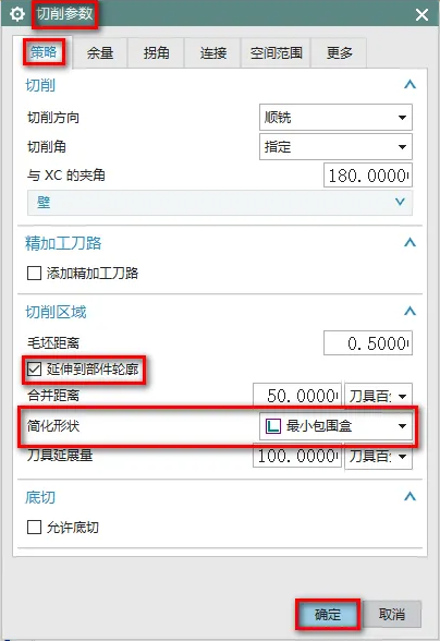 4、在切削参数界面中,策略-打开延伸到部件轮廓,简化形状-最小包围盒,延伸到部件轮廓就是指的工件最大外形,因为是异形工件,所以最大外形需要使用最小包围盒来控制,最小包围盒就是按照加工的范围创建一个虚拟的方形做为面边界,如下图所示:
