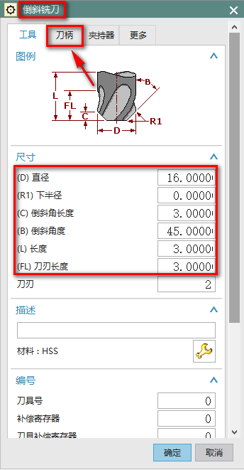 2、在倒斜铣刀界面中,直径是实际刀具直径大小,这里设置为16MM。倒斜角长度是指刀具C角距离的高度,因为倒角刀的角度为45度,16MM的直径单边去掉3MM,那么刀柄的直径就为10MM,所以这里设置为3MM。接下来是设置长度与刀刃长度,因为要精准的设置刀柄为10MM,所以这里全部改成3MM,设置好这些参数后点击刀柄,如下图所示: