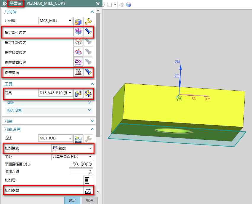 5、在平面铣工序界面,指定部件边界选择工件背面孔的边界。因为倒角刀具是3MM高度,所以指定底面选择最下面的平面加深4MM。刀具选用刚创建好的倒角刀,切削模式-轮廓,点击切削参数,如下图所示: