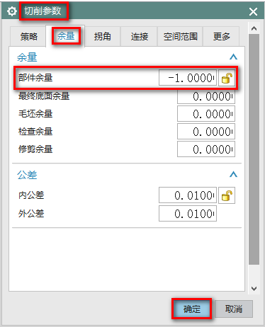 6、在切削参数界面,余量-部件余量这个根据你需要倒的C角大小去设置,这里参考设置为1MM,点击确定,如下图所示: