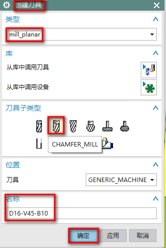 1、在加工界面中,创建刀具-mill-planar,选择第二个创建倒角刀具,刀具名称与大小根据实际情况去设置,这里以D16-V45-B10作为参考,如下图所示: