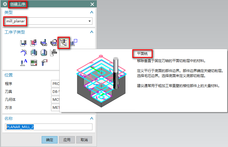 4、在加工界面中,创建工序-mill-planar-平面铣,如下图所示: