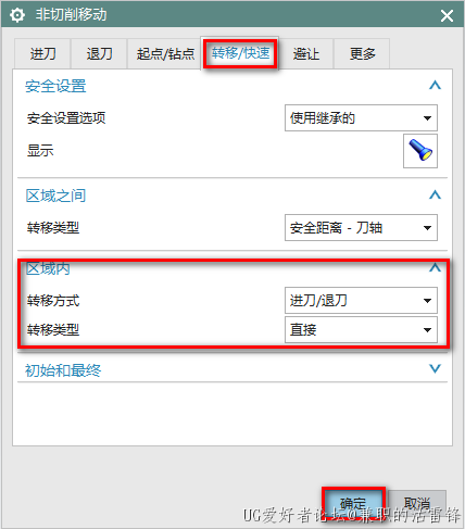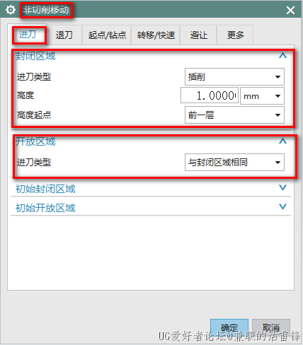 4、在非切削移动-进刀界面,封闭区域