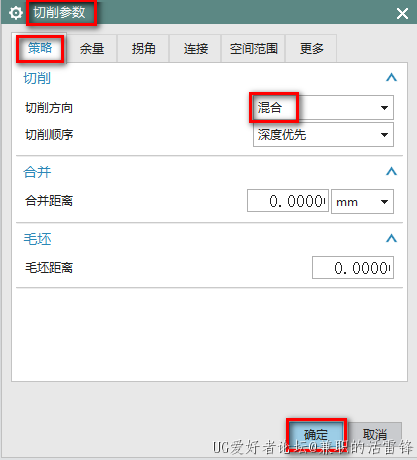 3、在切削参数界面,策略-切削方向-混合这样设置刀轨就往复加工,从而提高加工效率,点击确定,如下图所示: