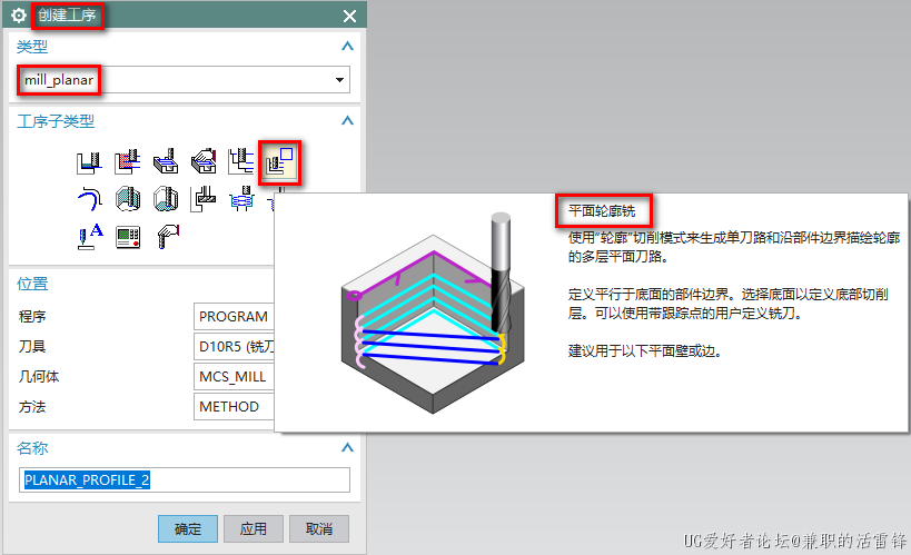 1、在加工界面中,创建工序-mill-planar-平面轮廓铣,如下图所示: