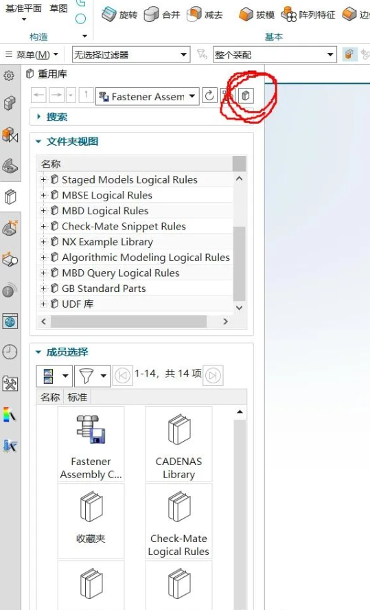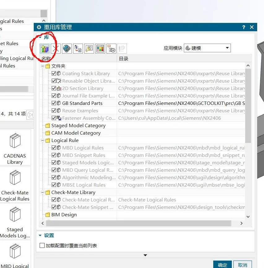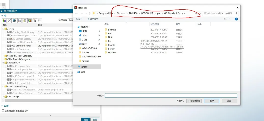 然后按下面的方法在重用库管理里添加库,找到安装路径\Program Files\Siemens\NX2406\GCTOOLKIT\prc\GB Standard Parts添加就可以了。