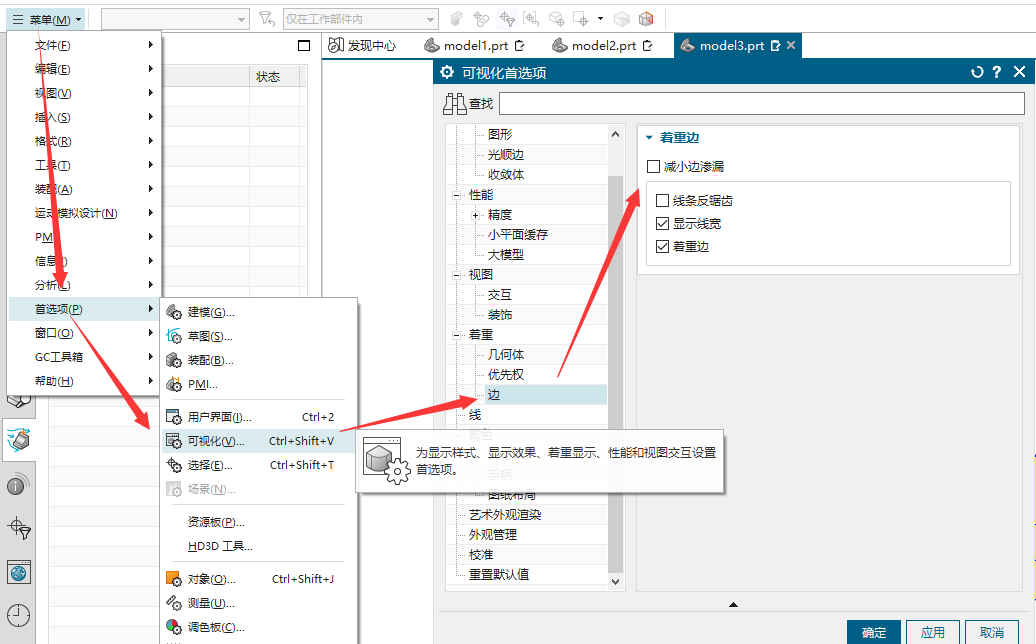 NX2306中,首选项--可视化--着重--边--减小边渗透。