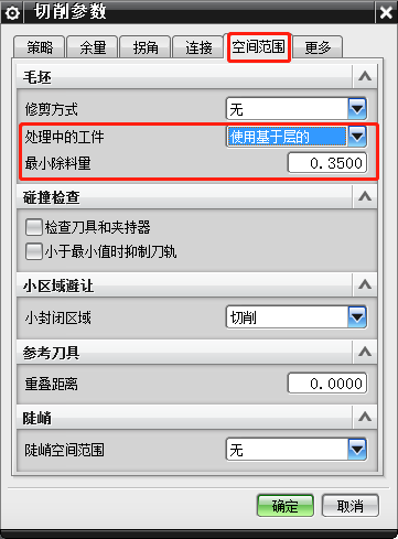 1、在型腔铣里打开切削参数-空间范围,处理中的工件选择使用基于层的,设置最小除料量可以优化一些碎刀,如下图所示: