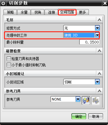 1、型腔铣中,打开切削参数-空间范围,处理中的工件选择使用3D,如下图所示: