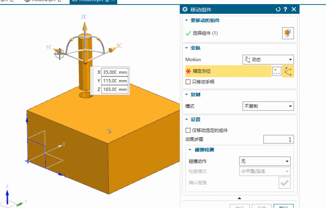 回到装配文件中移动圆柱,下方孔的位置也会跟着改变。
