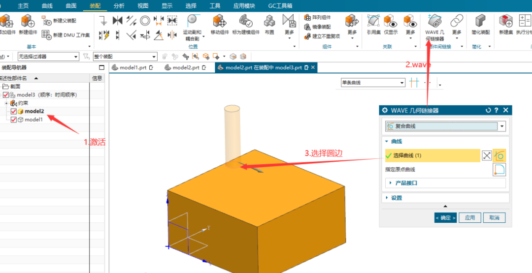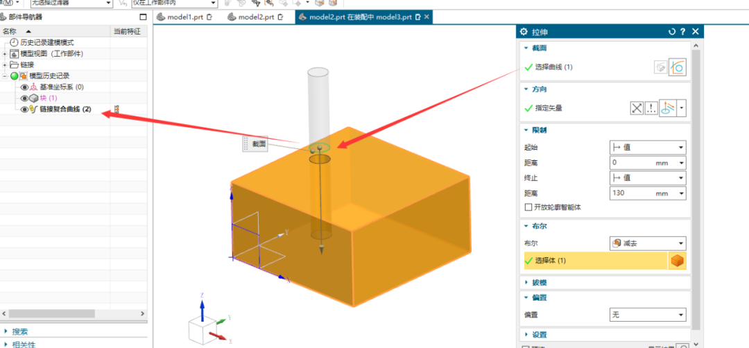 先将方块设置为工作部件,使用WAVE几何链接器,选择圆柱底部的圆边后确定。